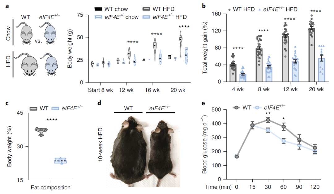 eIF4E是真核细胞中重要的翻译信使核糖核酸(mRNA)到蛋白的起始因子,Dr. Ruggero组曾发现,在小鼠中通过基因编辑孵育的只含有一个拷贝的eIF4E+/-小鼠,虽然只表达50%量的eIF4E,但是不影响小鼠整体的mRNA翻译,而是只针对性影响特定一类基因的表达,特别是一些致癌基因通路中的基因。在此项研究中,研究团队在5个月的时间里连续给正常野生型(WT)小鼠和eIF4E基因单拷贝敲除的杂合子(eIF4E+/-)小鼠喂食高脂肪食物。结果发现,杂合子小鼠增重仅为野生型小鼠的一半,这表明eIF4E与肥胖相关的脂肪储存有关。