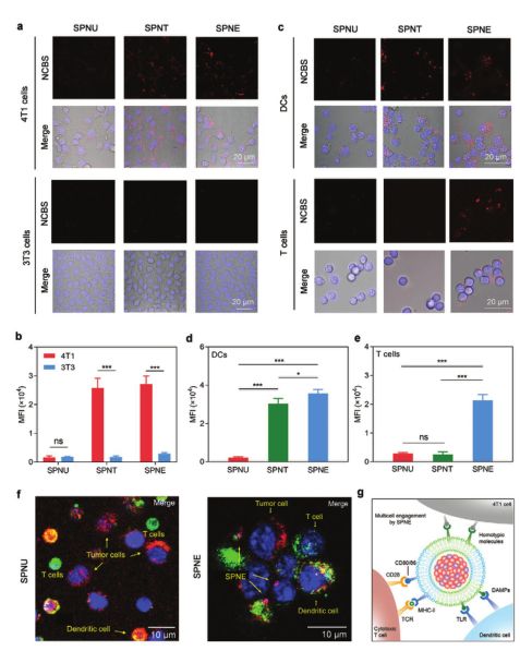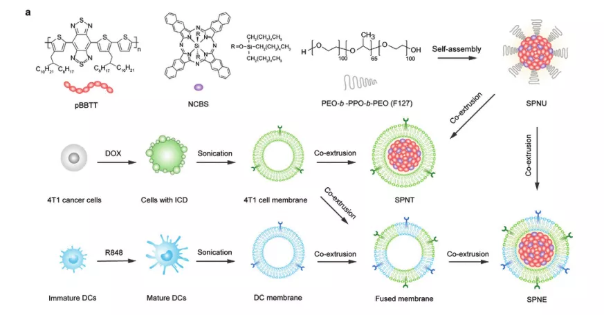 多细胞纳米接合器(SPNE)由一种NIR‐II吸收聚合物作为光热核,由免疫工程肿瘤细胞和树突状细胞(DC)形成的融合膜伪装成癌症疫苗的外壳,这种设计允许肿瘤细胞、DC和T细胞之间的多细胞结合。与淋巴结和肿瘤的高聚集相关,SPNE的多细胞结合能力使肿瘤细胞、DCs和T细胞之间能够进行有效的交叉相互作用,导致相对于裸的或肿瘤细胞包覆的纳米粒子而言T细胞激活增强。如图1,为了在近红外窗口获得有效的吸收,通过施蒂勒反应合成了聚合物pBBTT, 将其与荧光染料NCBS进行掺杂获得近红外荧光属性。加入PEG-b-PPG-b-PEG,得到水溶性纳米粒子(SPNU)。