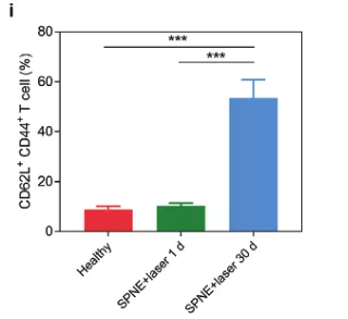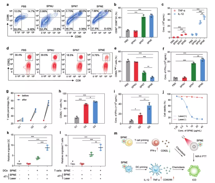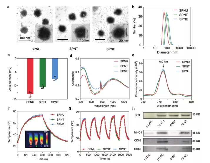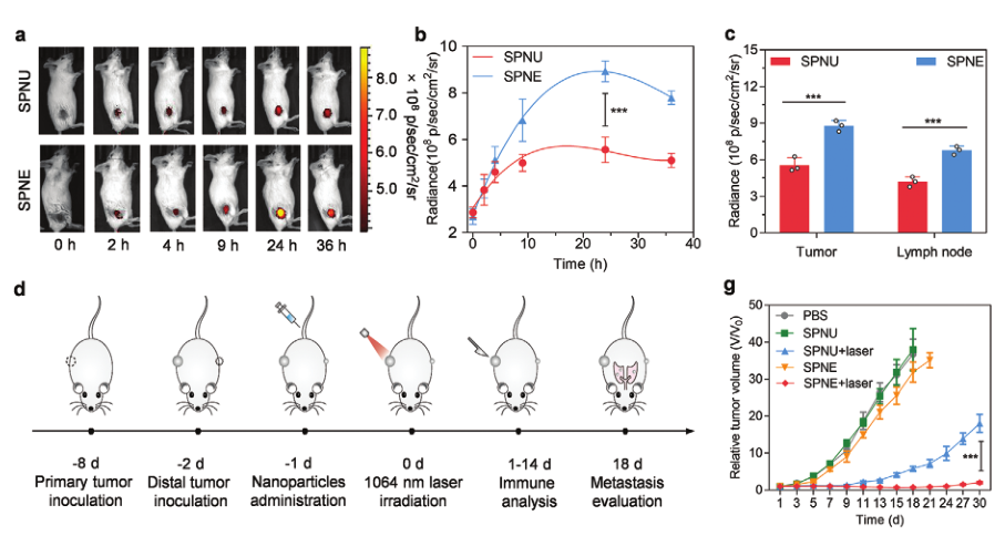 研究人员给4T1荷瘤小鼠静脉注射SPNE或SPNU后,通过近红外荧光成像来评估SPNE和SPNU的最佳治疗窗(图5a,b)。在注射24h后,SPNE和SPNU注射小鼠肿瘤的荧光强度逐渐增加并达到峰值,此时,来自SPNE处理的小鼠的肿瘤的信号比来自SPNU处理的组的信号高1.8倍。说明了在4T1荷瘤小鼠上检测了SPNE介导的近红外-ⅱ型光热免疫疗法的治疗效果更好。