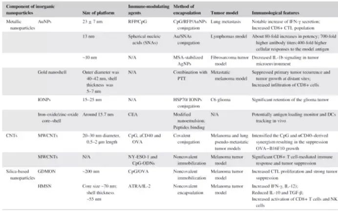 无机纳米颗粒包括金属纳米颗粒(MNP)、碳纳米管(CNT)和硅基纳米颗粒三种,其中金属纳米颗粒(MNP)因其传递的准确性和可控性,在癌症免疫治疗中受到高度重视。与其他纳米颗粒相比,MNP具有更高的密度,更容易被AMP吸收,在癌症疫苗接种中表现了高重复性和高效率。MNP还具有独特的光学特征,可用于MNP调控的肿瘤消融联合免疫治疗。负载的CNT比其他纳米颗粒更有效的免疫反应。硅基纳米颗粒能增强CD4+和CD8+免疫反应,提高NK细胞的活化,是疫苗免疫治疗的有效载体。