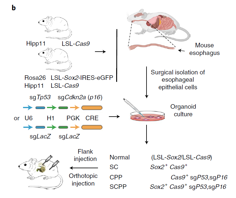 研究团队建立了一个食道类器官来模拟和追踪从正常食道到完全转化的癌症发展过程。该研究中的类器官从SOX2基因的过表达开始,SOX2基因扩增是食道癌的基因特征之一。通过食道类器官,研究团队分析了SOX2在正常组织和癌性组织中的活性差异,对同时具有SOX2过表达和抑癌基因p53/p16缺失的类器官研究发现,SOX2会开启各种致癌基因表达,还会激活内源逆转录病毒(ERV),让癌细胞更依赖于ADAR1。