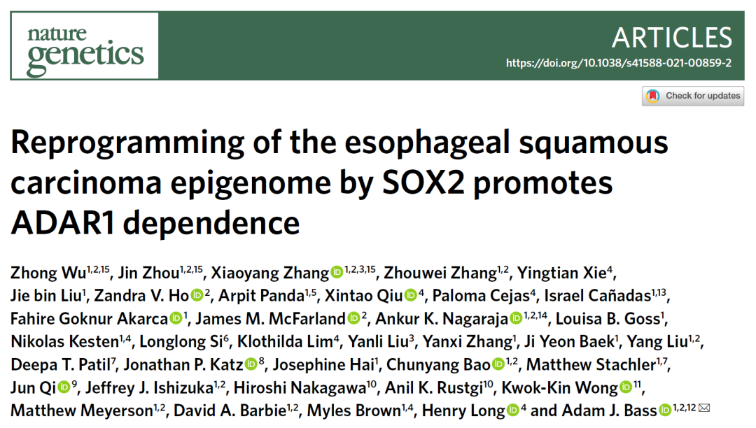近日,哈佛医学院研究所 Adam Bass 团队在 《Nature Genetics 》在线发表了“Reprogramming of the esophageal squamous carcinoma epigenome by SOX2 promotes ADAR1 dependence” 的文章。该研究发现,食道癌中的促癌基因SOX2会激活嵌入人类基因组的古老逆转录病毒的表达,从而促使食道癌细胞对ADAR1产生依赖。