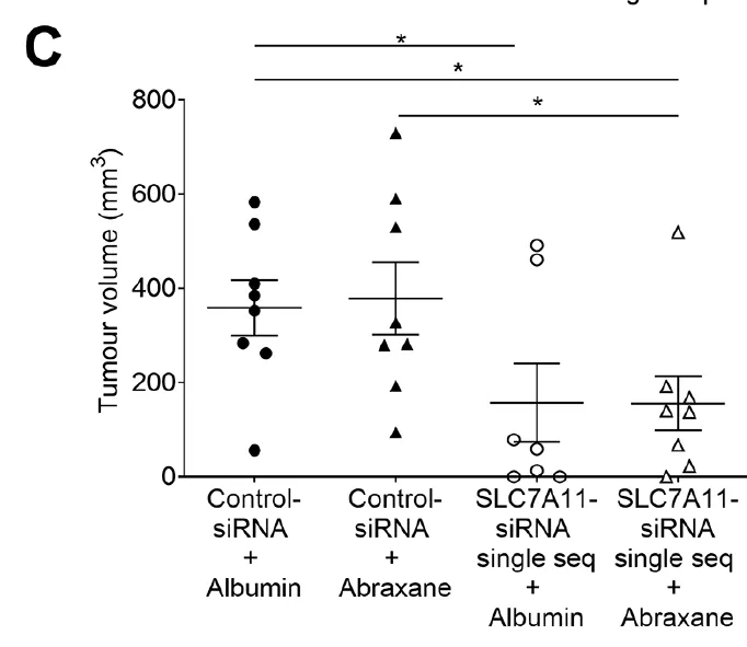 研究发现,在胰腺癌细胞和肿瘤周围的癌症相关成纤维细胞(CAF)中,SLC7A11的表达水平与患者的生存期有重要的关系。如果SLC7A11表达水平高,那么患者的生存期相对较低。SLC7A11的主要功能之一是运送胱氨酸,它在支持癌细胞的蛋白合成以及合成抗氧化剂方面具有重要作用。为探究降低SLC7A11的表达,是否能扰乱胰腺癌细胞和CAF之间的相互作用,从而达到缩小肿瘤的效果。研究人员设计了一种能够有效降低SLC7A11的siRNA,他们发现,降低SLC7A11表达的siRNA起到了多重作用:它不但减少了CAF的增生,而且让胰腺癌细胞对氧化应激和铁死亡(ferroptosis)更为敏感。