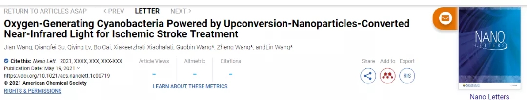 [1]Jian Wang., et, al. (2021).Oxygen-Generating Cyanobacteria Powered by Upconversion-Nanoparticles-Converted Near-Infrared Light for Ischemic Stroke Treatment. Nano Letters, 2021. DOI:10.1021/acs.nanolett.1c00719