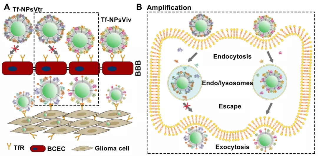 该研究从入胞、胞内转运和出胞三方面系统性探究了体内外蛋白冠对Tf介导的脑肿瘤靶向纳米粒BBB跨膜转运效率的影响,强调了体内外蛋白冠对该转运过程的不同影响。体外蛋白冠的形成使Tf介导的受体特异性识别能力、溶酶体逃逸能力以及跨膜转运能力丧失;而体内蛋白冠的形成虽然保留了受体识别能力和溶酶体逃离能力,但效率有所削弱。