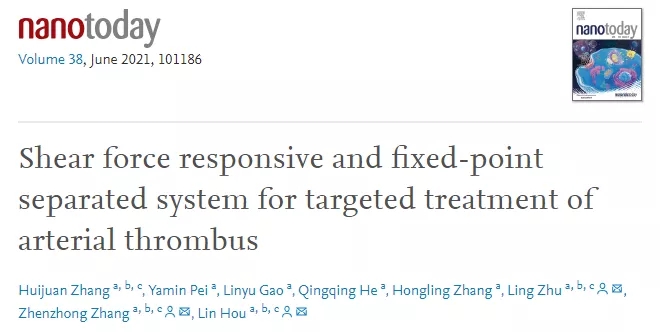[1]Huijuan Zhang ., et, al.Shear force responsive and fixed-point separated system for targeted treatment of arterial thrombus. Nano Today, 2021. DOI:10.1016/j.nantod.2021.101186
