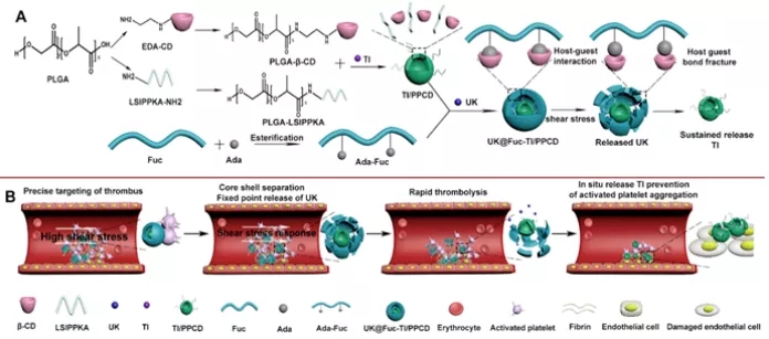 血管栓塞性疾病现已成为危害人类生命健康的重大疾病之一。目前临床上通常采用静脉滴注纤溶药物(如尿激酶、rt-PA)进行溶栓。但这类药物作用位点宽泛,缺乏血栓特异性,易破坏人体正常的纤溶-凝血系统平衡,产生严重的不可控出血并发症。且溶栓后的血管局部呈高凝状态,活化血小板很可能会再度聚集形成新的血小板血栓,易导致溶栓后血管再栓塞,极大降低溶栓效果。实现溶栓药物在血栓局部的特异性递送和可控释放,并防止溶栓后血小板再度聚集,是目前临床溶栓面临的关键难题。