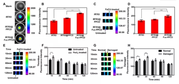 血栓靶向结果表明,Fuc-PPCD NPs可利用岩藻多糖对血栓表面高表达的P-选择素的主动识别,快速聚集于血栓部位,给药10 min荧光强度最高。随着剪切力的作用,Fuc壳层脱落,暴露PPCD内核,通过LSIPPKA-LOX-1配体-受体作用,特异性识别溶栓部位的受损血管,给药30 min时损伤侧颈动脉血管内PPCD NPs积聚量显著多于正常血管侧。