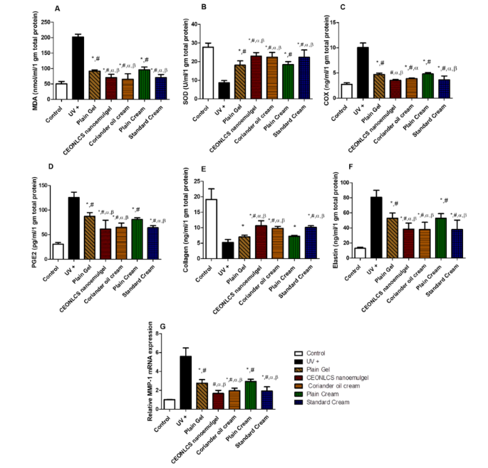 研究发现,经过紫外线照射后,使用香菜油配方制成的乳膏和纳米乳胶制剂能显著降低氧化应激标志物丙二醛的水平,并提高抗氧化酶超氧化物歧化酶的水平,表明它们能有效抑制由紫外线引起的活性氧自由基的产生。