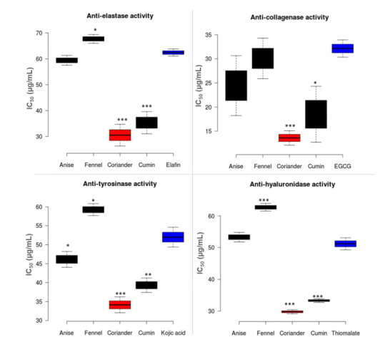 本研究首次揭示了香菜油纳米制剂在抗皮肤衰老方面的活性。通过监测精油对几种关键酶——弹性酶、胶原酶和酪氨酸酶的影响,科学家们评估了这些精油的美肤效果。香菜油在所有精油中表现最佳,能有效地抑制弹性酶和酪氨酸酶的活性,这些酶与皮肤老化和色素沉着密切相关。香菜油的IC50(即抑制酶活性50%所需的浓度)分别为30.5微克/毫升和34.14微克/毫升,显示出它的强大效能。