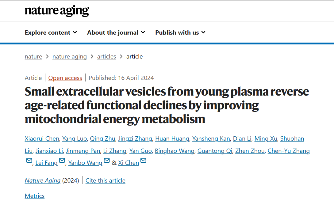 近日,来自南京大学生命科学学院生命科学高等研究院(NAILS)的研究人员在 Nature aging 杂志发表了题为 Small extracellular vesicles from young plasma reverse age-related functional declines by improving mitochondrial energy metabolism 的文章,探讨了衰老的生物学机制以及如何通过改善线粒体能量代谢来逆转与衰老相关的功能衰退。