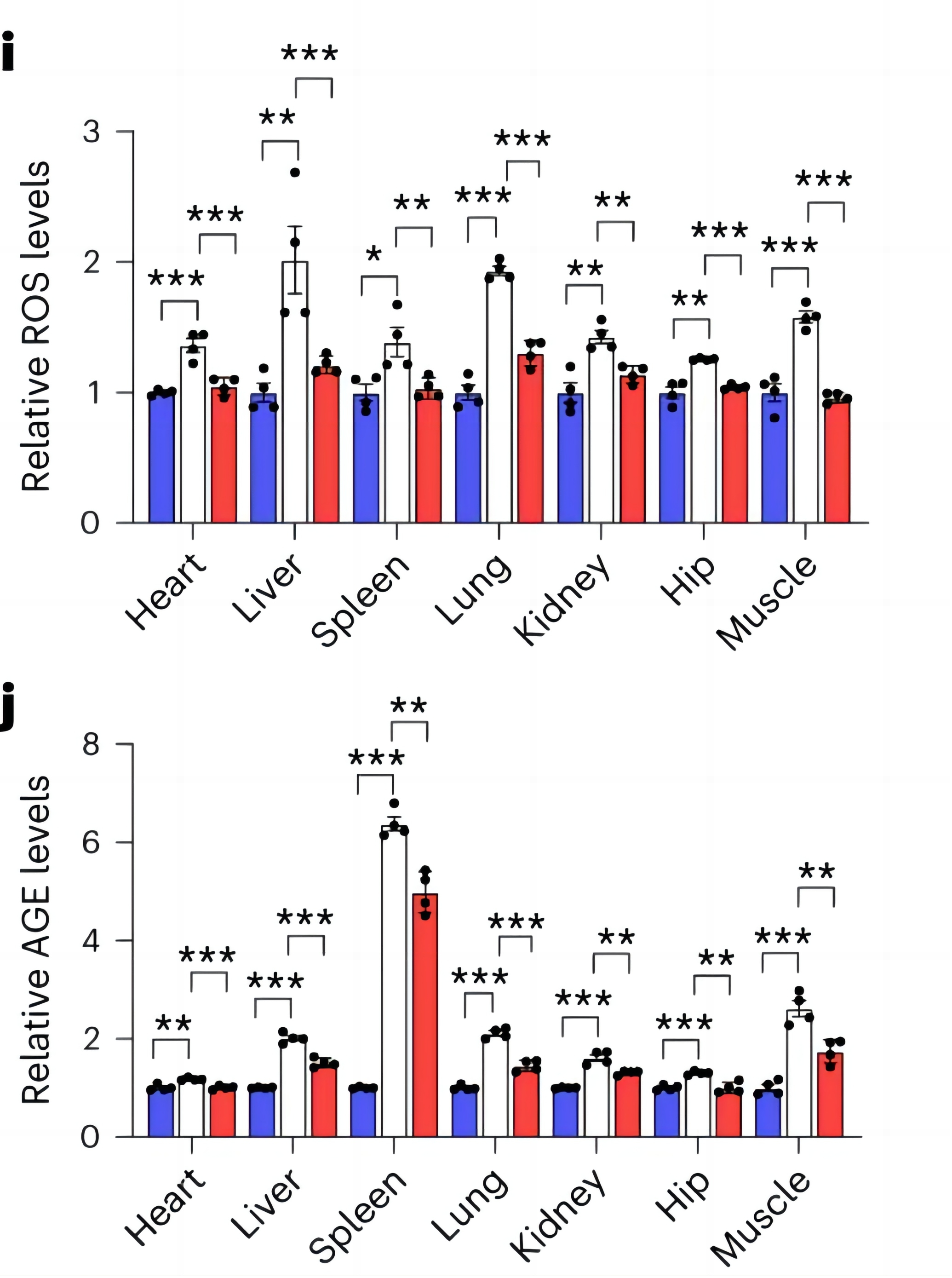 同时,这种治疗能显著降低老年小鼠体内活性氧(ROS)水平,恢复到年轻状态,并显著减少晚期糖基化终产品(AGEs)和脂褐素的累积。长期注射年轻sEVs也有效地恢复了老化组织的活力并抑制了细胞衰老的进程,特别是在脾脏、肾脏、海马和睾丸等关键区域。这些发现证明了年轻sEVs对抗衰老的潜在效果。