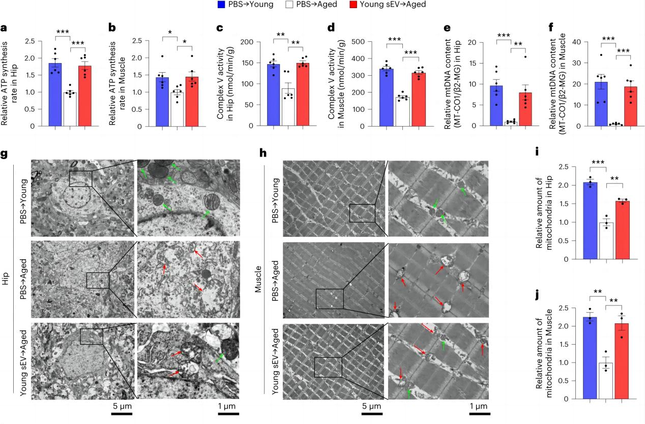 实验研究了年轻sEVs如何显著改善老年小鼠在多种组织中的线粒体功能,包括海马和肌肉组织。这些组织对老化特别敏感,因为它们依赖于高效的能量代谢来维持功能。