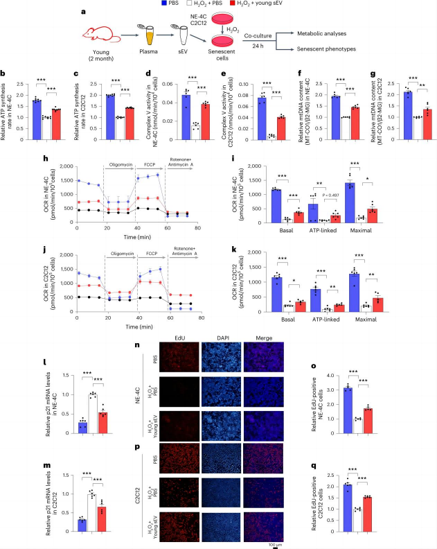 在使用过氧化氢(H2O2)诱导细胞衰老的实验中,那些未经处理的细胞表现出明显的呼吸链功能障碍,其ATP合成速率、复合体V活性和mtDNA拷贝数均显著下降。然而,引人注目的是,年轻sEVs的加入不仅逆转了这些衰老标志,还显著提升了细胞的氧消耗率(OCR),这是评估线粒体呼吸和氧化磷酸化能力的关键指标。