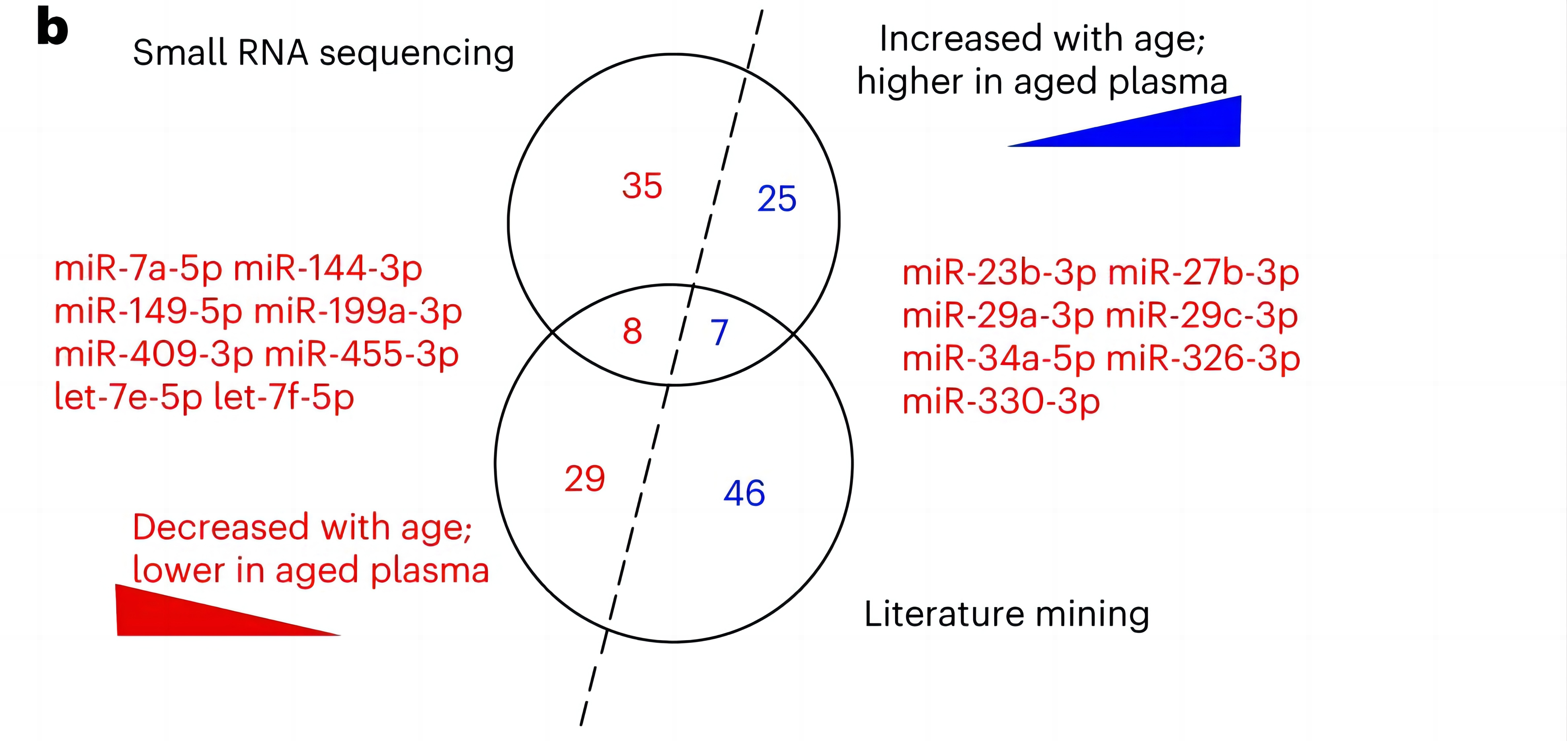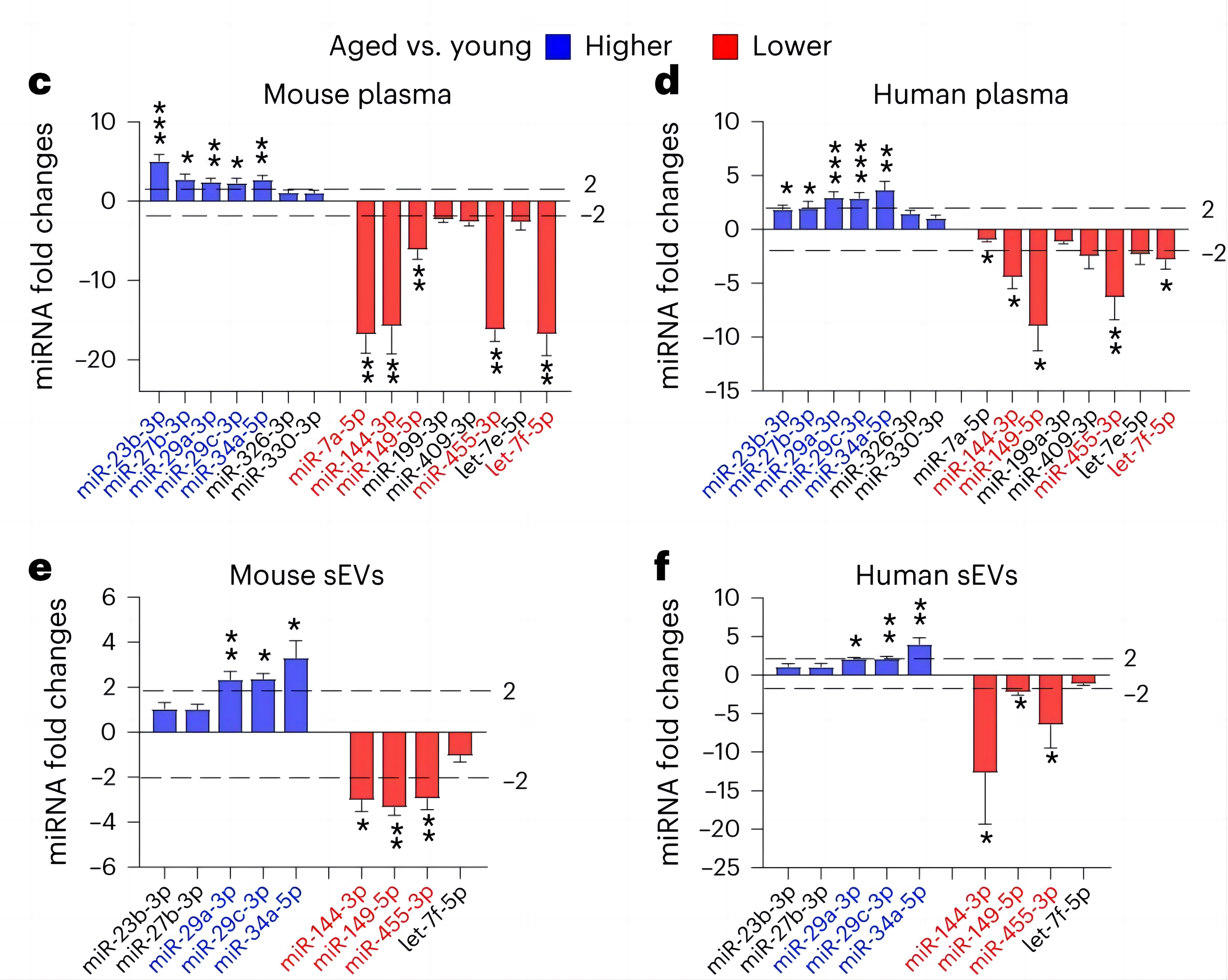 研究小组进一步鉴定了与年龄相关的90个特征miRNA,并发现有53个随着年龄增长而增加,37个随着年龄增长而减少。这些miRNA在老年与年轻小鼠以及人类的血浆sEVs中的表达差异被进一步证实。