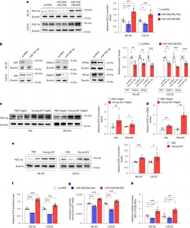 研究人员首次在体外和体内环境中验证了年轻sEVs对PGC-1α表达的影响。结果表明,注射年轻小鼠来源的sEVs可以显著增加老年小鼠海马和肌肉组织中的PGC-1α水平,这与年轻sEVs在细胞培养模型中同样增加PGC-1α表达的结果一致。这一效应对于线粒体的功能至关重要,因为PGC-1α能够增强线粒体的质量控制,从而维护细胞能量平衡。