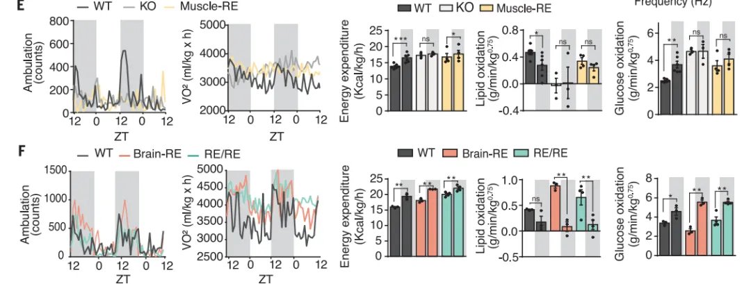 研究人员首先发现,实验用Bmal1基因敲除小鼠由于缺乏Bmal1基因,表现出生物钟功能失常,并且导致提前衰老以及肌肉萎缩。为了研究大脑和肌肉生物钟的相互作用,研究人员通过特定的遗传操作在小鼠的肌肉或大脑中重新表达了Bmal1基因,创建了不同的小鼠品系。