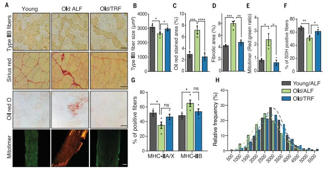 研究人员还探讨了时间限制性进食(TRF)对肌肉功能的影响,特别是在生理老化和肌肉衰老的背景下。研究人员将小鼠分为两组,一组进行随意进食(ad libitum feeding, ALF),另一组进行时间限制性进食(TRF)。TRF组的小鼠只在它们的活跃期(夜间)有限制地进食,进食窗口为9到10小时。